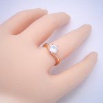 1カラットのダイヤモンドは圧倒的な存在感ですが、ピンクゴールドの優しい色味が全体を柔らかく見せてくれます。Vラインのアームが指の根元に向かってスッと流れるため、指が長く細く見える効果があり、とても気に入っています。